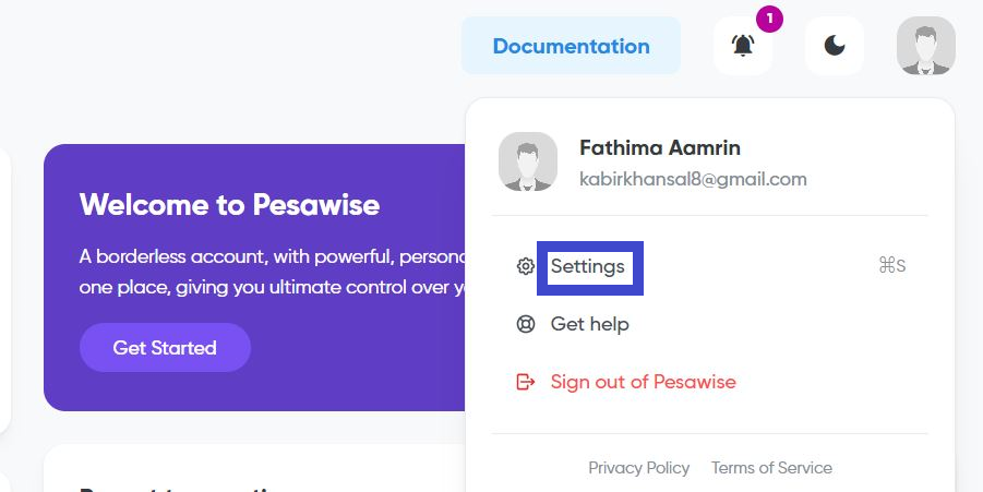 Once you create an account in Pesawise, Two Keys are automatically generated. The API Key and the API secret. You can change both these keys in the settings. When you login to Pesawise, by default it takes you to the Home Page of the application. To access the keys :